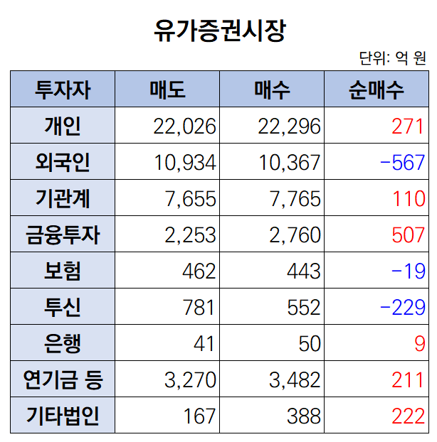 이날 코스피 시장에서 외국인은 567억 원 어치를 순매도하며 ‘팔자’ 세로 돌아섰다. 반면 개인과 기관은 각각 271억 원, 110억 원 규모를 순매수했다.