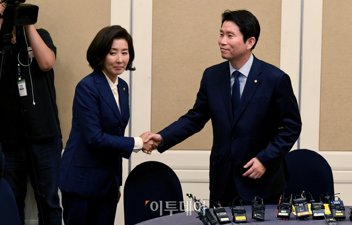 이인영(오른쪽)) 더불어민주당 원내대표와 나경원 자유한국당 원내대표가 16일 서울 여의도 국회 귀빈식당에서 패스트트랙으로 지정된 검찰개혁 법안과 선거제 개편안에 대한 협상을 하기 위해 만나 악수하고 있다.