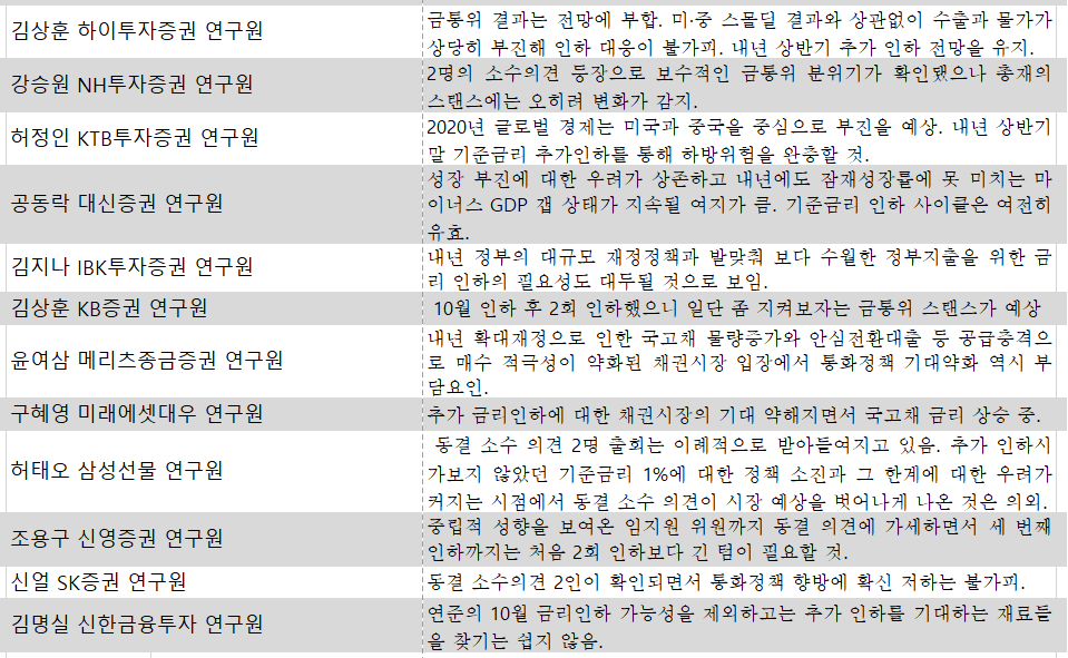 김상훈 하이투자증권 연구원은 ”미·중 스몰딜 결과와 상관없이 수출과 물가가 상당히 부진해 인하 대응이 불가피하다“며 “실질적인 펀더멘털 개선에 영향이 미미하며 추가 협상까지 진통이 예상되기 때문에 내년 상반기 추가 인하 전망을 유지한다”라고 밝혔다.