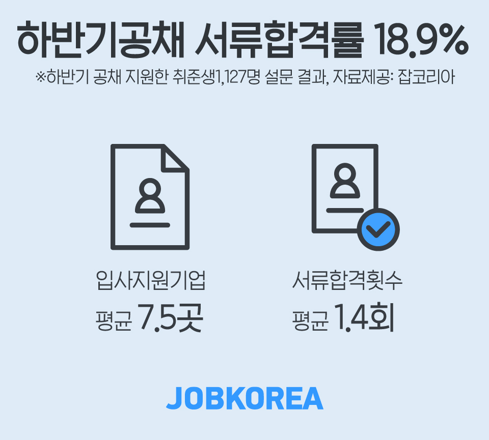 잡코리아에 따르면 올 하반기 신입공채에 도전한 취준생들이 지원한 기업수는 평균 7.5곳이지만, 이들 기업에서 합격통보를 횟수는 1.4회로 하반기 취준생들의 서류전형 합격률을 평균 18.9%에 그쳤다.