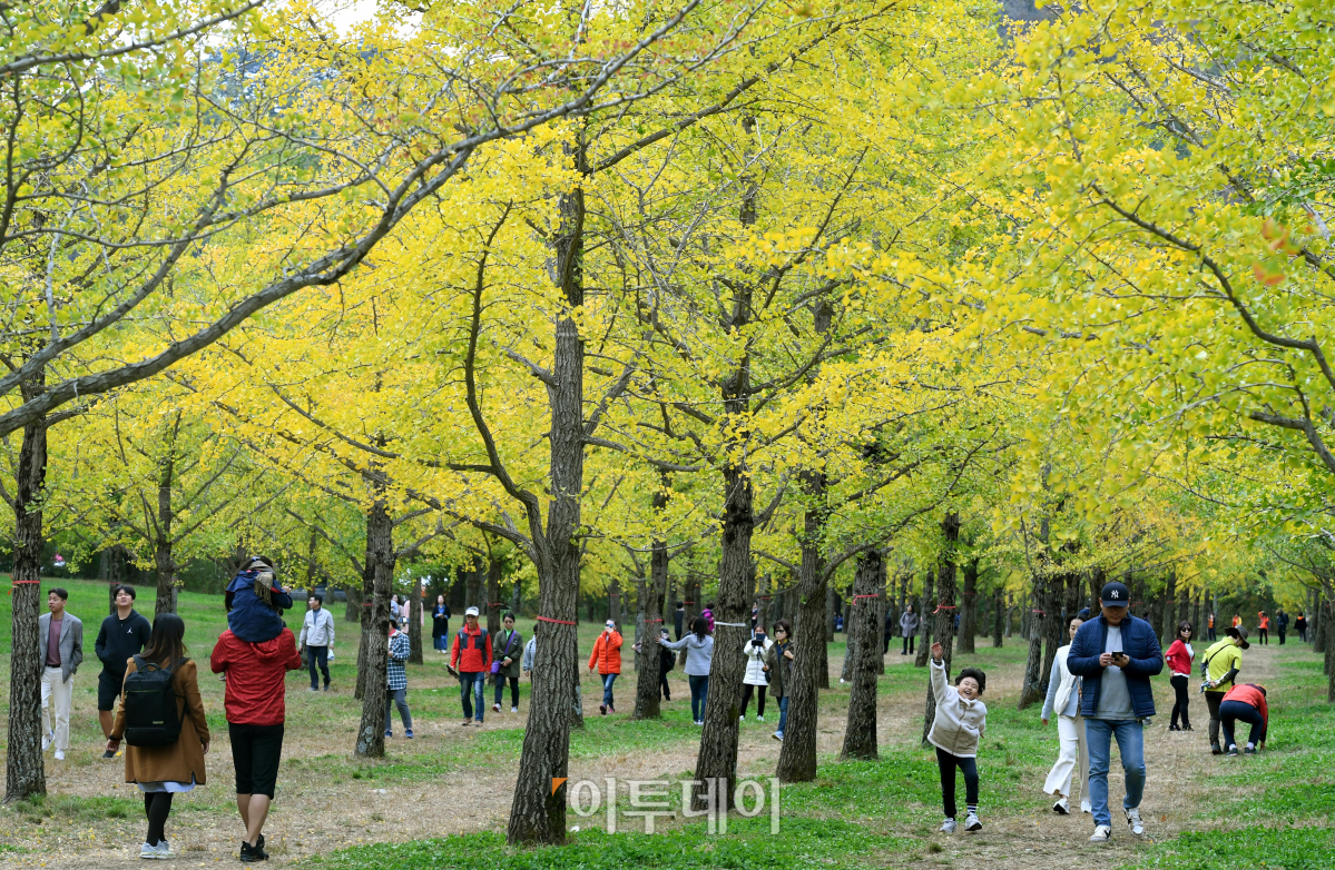 완연한 가을 날씨를 보인 17일 강원 홍천군 내면 은행나무 숲을 찾은 시민들이 노란 빛으로 물든 은행나무 숲을 걸으며 깊어가는 계절의 정취를 만끽하고 있다. 홍천 은행나무 숲은 1년 중 10월 한달간만 개방된다.