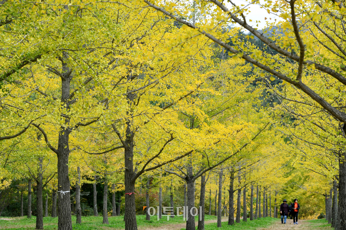 완연한 가을 날씨를 보인 17일 강원 홍천군 내면 은행나무 숲을 찾은 시민들이 노란 빛으로 물든 은행나무 숲을 걸으며 깊어가는 계절의 정취를 만끽하고 있다. 홍천 은행나무 숲은 1년 중 10월 한달간만 개방된다.