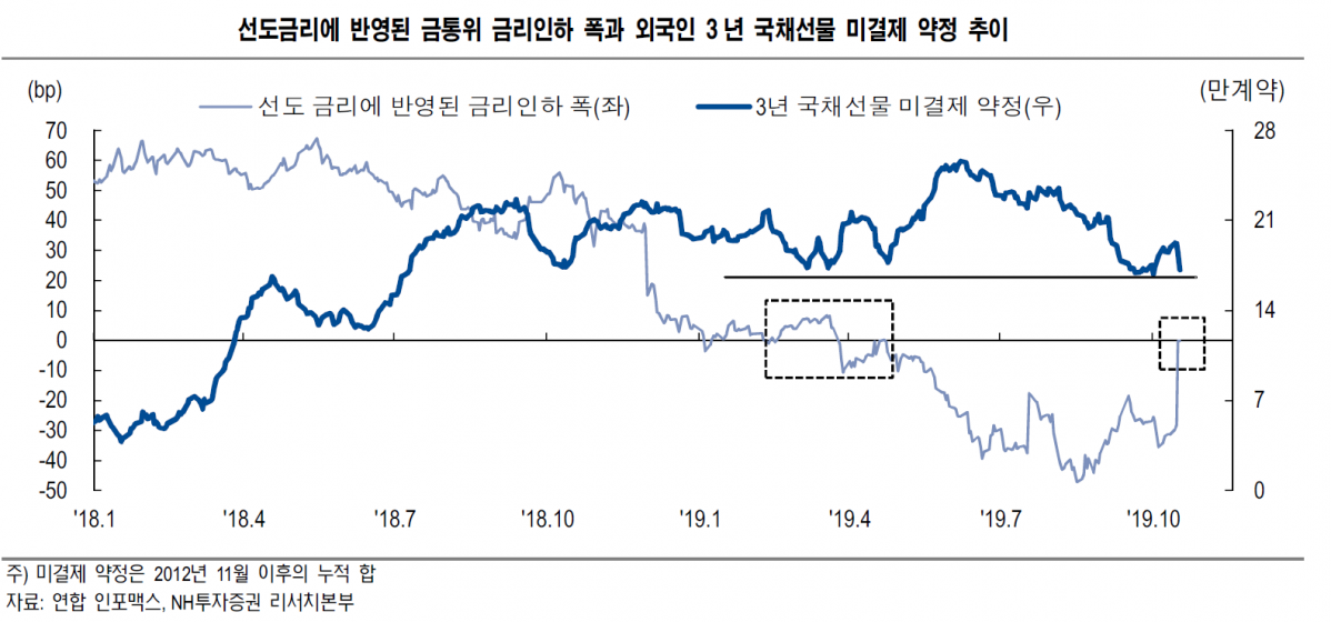 강 연구원은 “향후 외국인 국채 선물 수급 회복 여부는 결국 금통위의 추가 금리 인하 기대감이 다시 형성될 수 있을지 여부에 달려 있다”며 “최근 미국 지표 부진과 2020년 미국의 재정정책 여력이 제한됐음을 감안하면 올해 12월 연준이 점도표를 통해 2020년 금리 인하 여지를 열어둘 것으로 전망한다”고 예상했다.