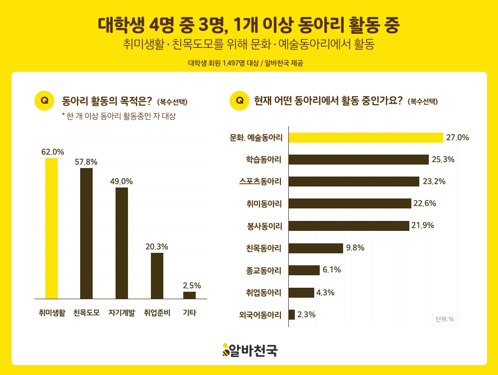 아르바이트 포털 알바천국이 지난 9월 25일부터 30일까지 전국 대학생 회원 1497명을 대상으로 ‘동아리 활동 하시나요?’ 설문조사를 실시한 결과를 17일 밝혔다.