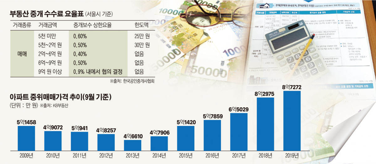서울시의 경우 주택 매매 시 △5000만 원 미만 0.6%(한도액 25만 원) 이내 △5000만~2억 원 미만 0.5%(한도액 80만 원) 이내 △2억~6억 원 0.4% 이내 △6억~9억 원 0.5% 이내 △9억 원 이상 0.9% 이내에서 소비자와 공인중개사가 중개료를 합의해 결정한다.