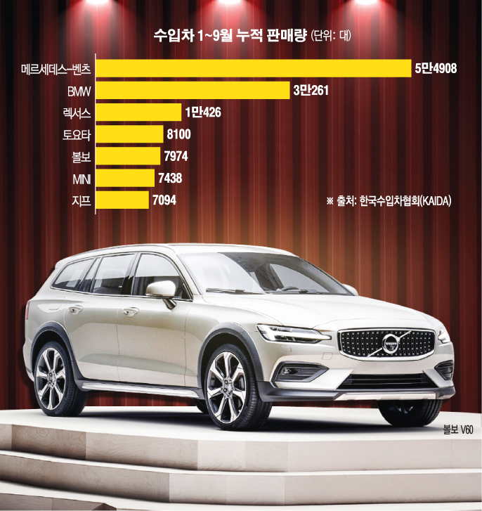 벤츠는 9월까지 5만4908대를 판매하며 올해 역대 최대 판매량을 경신할 것으로 보인다. BMW는 지난해 화재 사태로 어려움을 겪었음에도 9월까지 3만261대를 판매하며 판매세 회복에 박차를 가하고 있다. 렉서스는 일본 제품 불매운동이 본격화한 7월부터 월 판매량이 1000대 이하로 급감했지만, 올해 상반기 판매량이 많아 무난하게 연간 1만 대 판매를 달성했다.