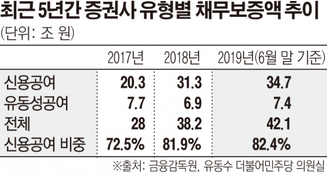 증권사의 채무보증 규모는 2017년 말 28조 원에서 지난해 말 38조2000억 원으로 1년 만에 10조 원 이상 늘었다. 이어 올 상반기에도 4조 원가량 추가로 증가했다. 이에 자기자본 대비 채무보증 비율도 2017년 말 53.5%에서 올해 6월 기준 72.1%으로 급격히 늘었다.