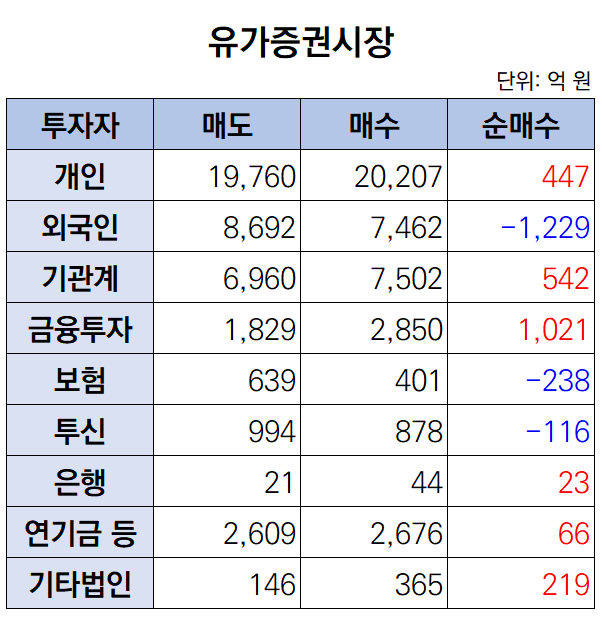 이날 외국인은 홀로 1229억 원 어치의 매물을 출회했다. 반면 개인과 기관은 각각 447억 원, 542억 원 규모를 순매수했다.