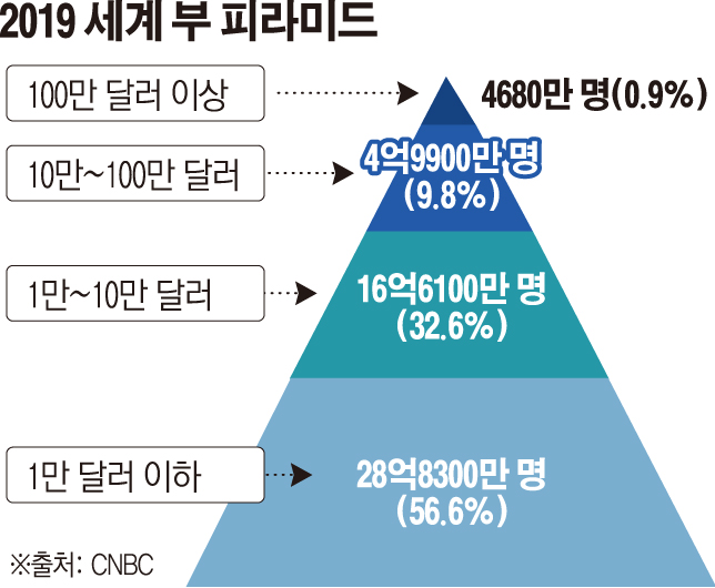 21일(현지시간) CNBC방송은 크레디트스위스(Credit Suisse)가 발간한 ‘글로벌 웰스 보고서’를 인용해 2019년 중반 기준으로 100만 달러(약 11억7000만 원) 이상을 보유한 자산가 수는 4680만 명(전체의 0.9%)으로 전년 동기 대비 110만 명 증가했다고 보도했다. 이들은 전 세계 부의 44%에 해당하는 158조3000억 달러를 보유하고 있는 것으로 집계됐다.