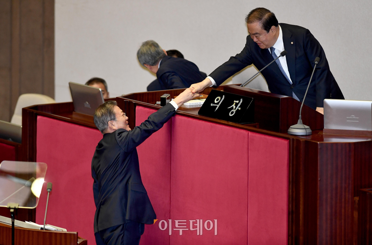 [포토] 문희상 국회의장과 악수하는 문재인 대통령