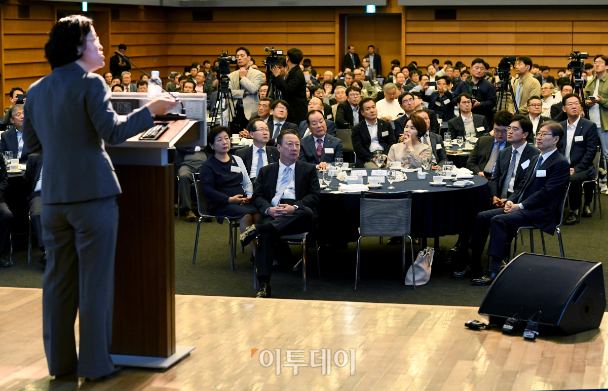 22일 서울 중구 대한상공회의소에서 열린 조성욱 공정거래위원장 초청 조찬강연회에서 박용만 대한상공회의소 회장, 현정은 현대그룹 회장, 윤부근 삼성전자 부회장 등이 조 위원장의 강연을 경청하고 있다.