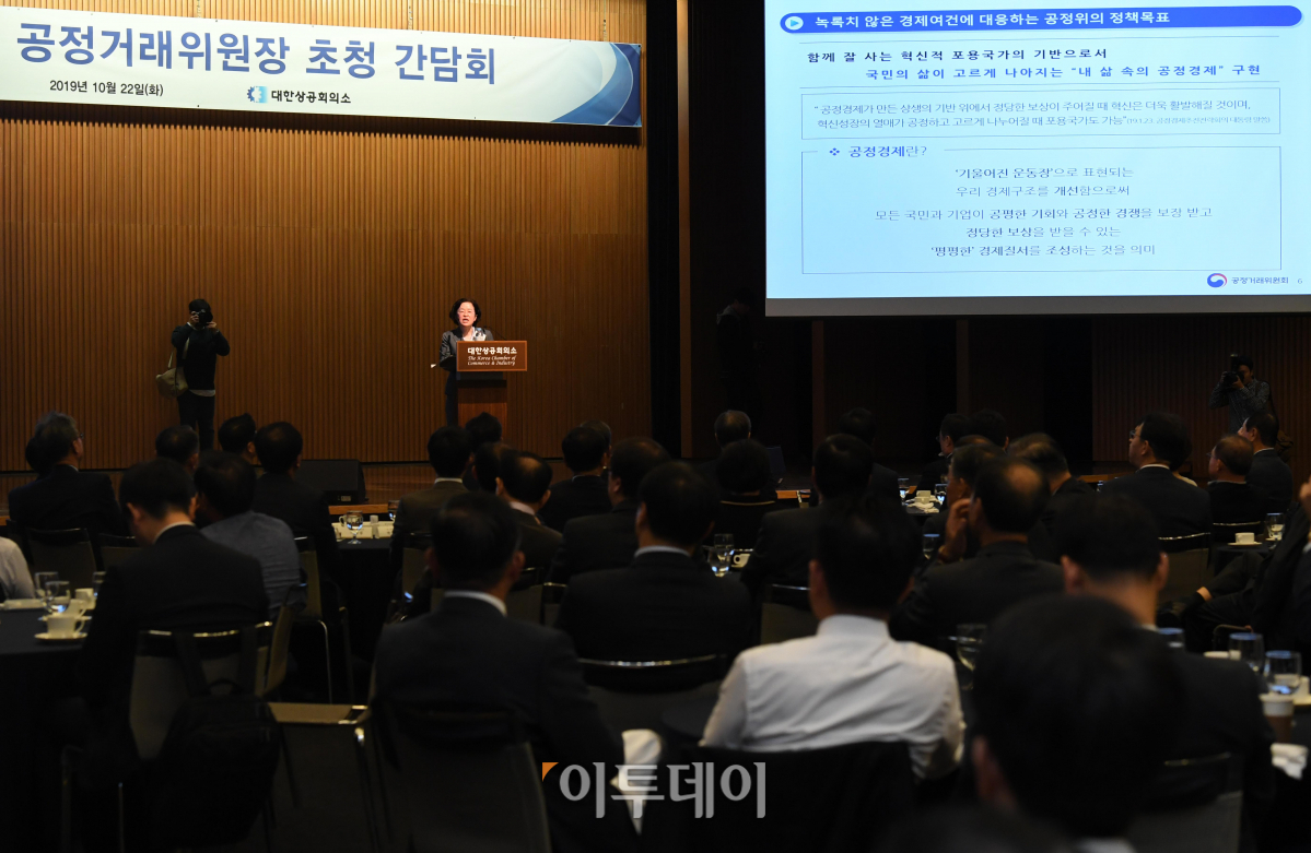 조성욱 공정거래위원장이 22일 서울 중구 대한상공회의소에서 열린 조찬강연회에서 ‘공정한 시장경제 생태계 조성을 위한 공정위 정책방향’을 주제로 강연하고 있다.