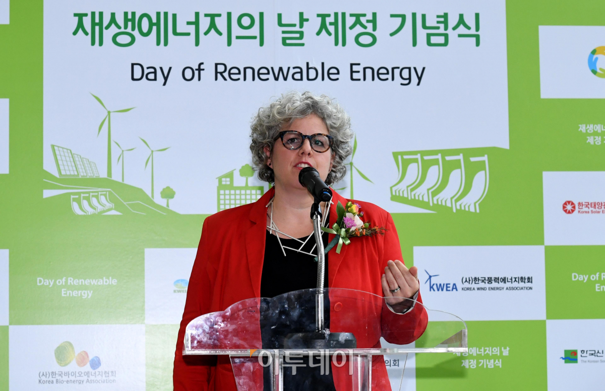 23일 서울 강남구 영동대로 코엑스에서 열린 ‘재생에너지의 날 제정기념식’에서 라나 아디브 신재생에너지정책국제단체 ‘REN21’ 사무국장이 축사를 하고 있다. ‘재생에너지의 날’은 재생에너지의 필요성을 공감하고 사회적 인식을 제고해 보급·확산하자는 의미를 담은 기념일이다.