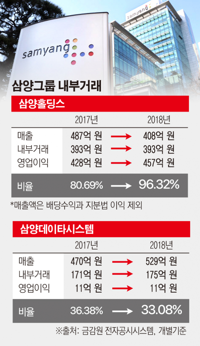 삼양그룹의 지주회사인 삼양홀딩스는 최대주주 및 특수관계인 41.71%의 지분을 보유하고 있다. 개별기준 지난해 매출액 830억5700만 원을 기록했다. 여기서 지주회사 관련 수익인 배당수익과 지분법 이익을 제외한 삼양홀딩스의 매출액은 408억 원이다. 이 중 96.32%에 해당하는 393억 원을 내부거래를 통해 올렸다. 2017년에는 지주회사 관련 수익인 배당수익과 지분법 이익을 제외한 매출액 487억 원 중 393억 원가량(80.69%)이 내부거래를 통해 발생됐다. 내부거래 매출 중 가장 높은 비율을 차지한 곳은 삼양사다.