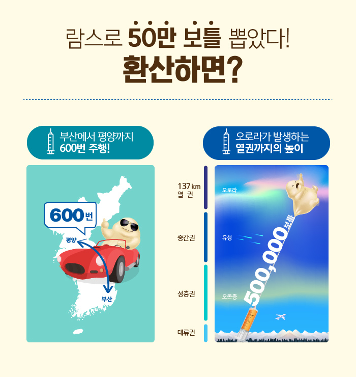 지금까지 람스로 빼낸 지방의 총 부피는 약 2747만cc, 휘발유로 치면 주유 후 평양에서 부산까지 약 6백번 주행할 수 있는 양이다. (연비 12km/l 가정) 또 람스에 사용된 주사기를 모두 이으면 성층권을 넘어 오로라가 발생하는 열권에 도달하는 길이다.