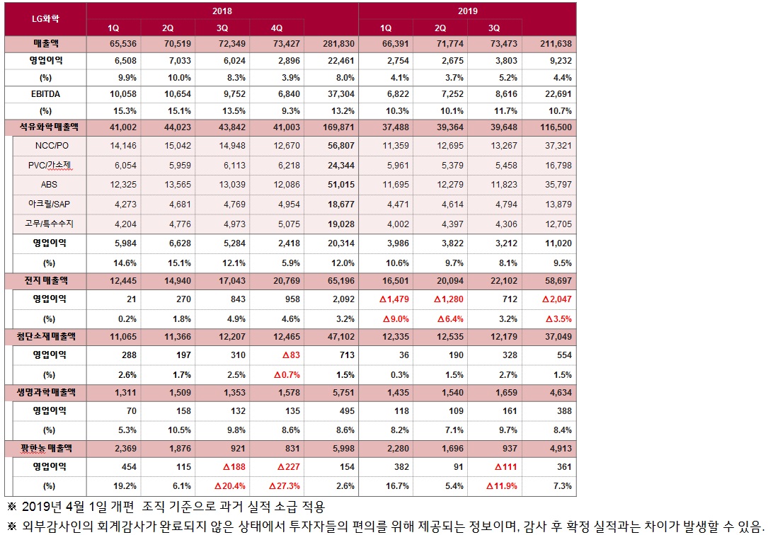 LG화학 관계자는 “석유화학 부문은 주요 제품 스프레드 축소로 수익성이 감소했지만 전지 부문 흑자전환, 첨단소재 및 생명과학 부문 수익성 증가 등 전사 전체적으로 전 분기 대비 고른 실적 개선을 달성했다”고 밝혔다.