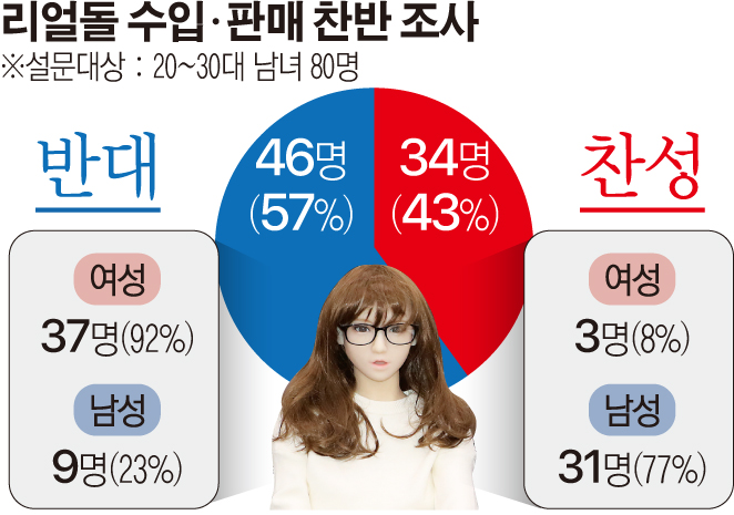 설문 결과 리얼돌 판매에 대한 남성과 여성의 답변이 뚜렷하게 갈렸다. 남성 응답자의 77%(31명)가 리얼돌 판매에 찬성했으나 여성은 92%(37명)가 반대했다. 리얼돌 수입ㆍ판매에 대한 전체 의견은 반대가 57%(남성 9명, 여성 37명)로 절반을 넘었다.