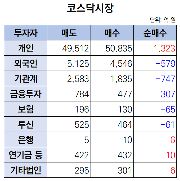 이날 개인은 1323억 원어치를 사들였다. 반면 외국인과 기관은 각각 579억 원, 747억 원 규모를 순매도했다.