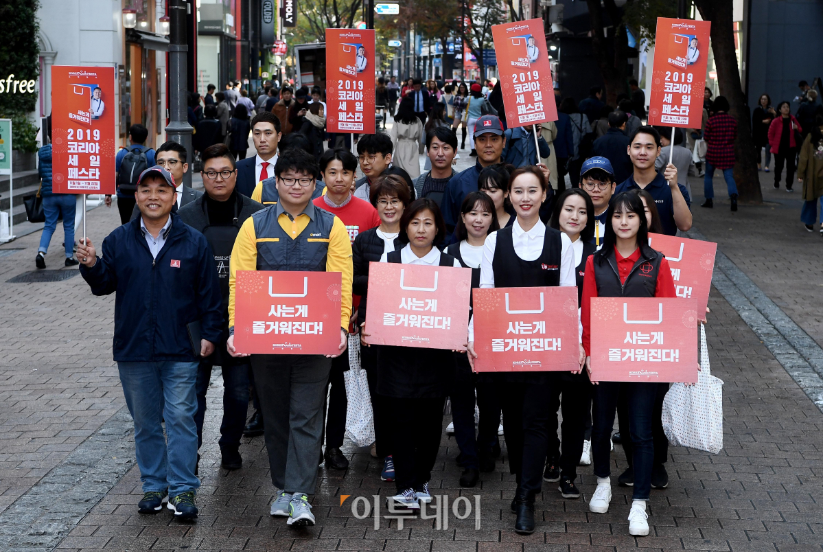 국내 최대규모의 쇼핑행사인 ‘2019 코리아세일페스타’ 시작을 하루 앞둔 31일 서울 중구 명동 일대에서 참여업체 관계자들이 코리아세일페스타를 홍보하고 있다. 올해 코리아세일페스타는 내달 1일부터 22일까지 전국 참여업체 매장과 온라인에서 동시에 진행되며, 약 650여개 유통·제조·서비스 업체가 업체별로 할인행사를 자율 추진한다.