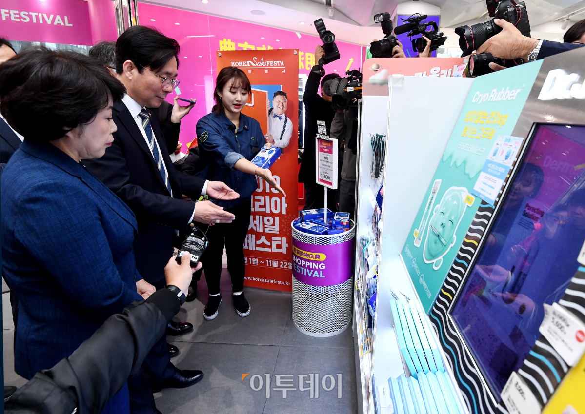 국내 최대규모의 쇼핑행사인 ‘2019 코리아세일페스타’ 시작을 하루 앞둔 31일 성윤모 산업통상자원부 장관과 김연화 2019 코리아세일페스타 추진위원회 위원장이 서울 중구 올리브영 명동본점을 찾아 제품을 살펴보고 있다. 올해 코리아세일페스타는 내달 1일부터 22일까지 전국 참여업체 매장과 온라인에서 동시에 진행되며, 약 650여개 유통·제조·서비스 업체가 업체별로 할인행사를 자율 추진한다.