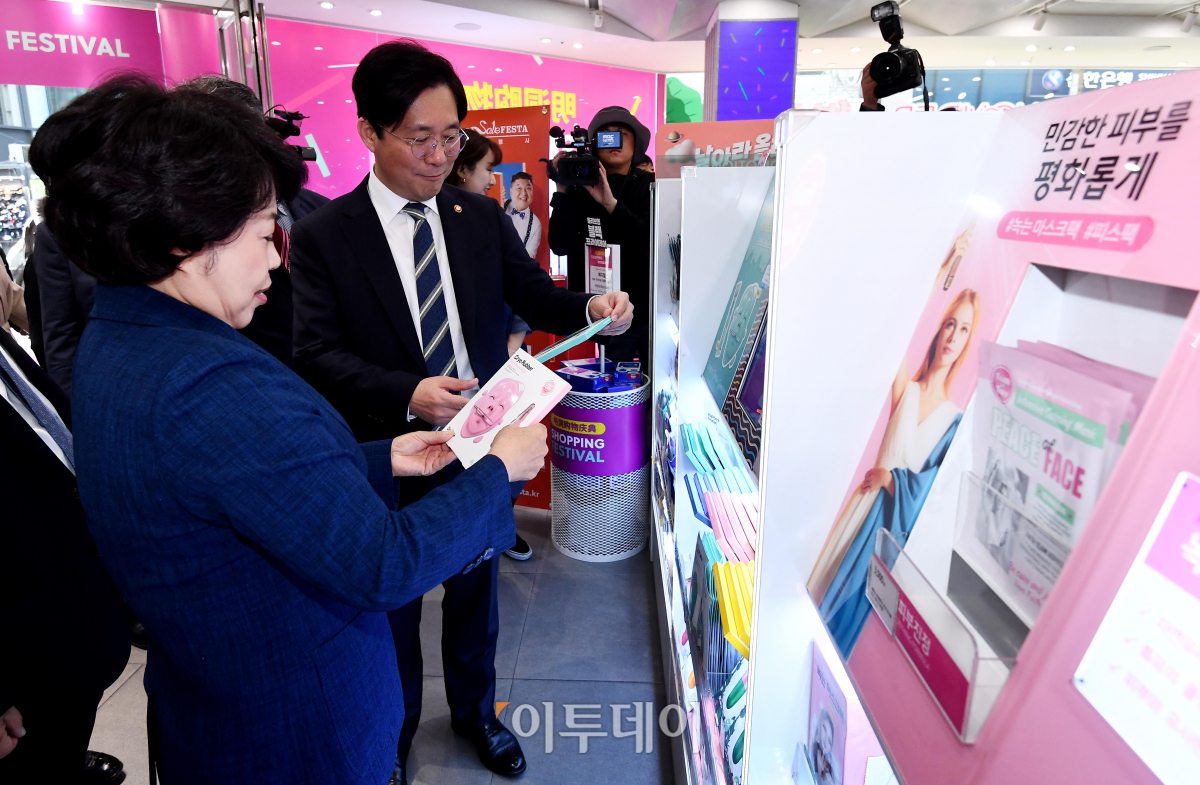 국내 최대규모의 쇼핑행사인 ‘2019 코리아세일페스타’ 시작을 하루 앞둔 31일 성윤모 산업통상자원부 장관과 김연화 2019 코리아세일페스타 추진위원회 위원장이 서울 중구 올리브영 명동본점을 찾아 제품을 살펴보고 있다. 올해 코리아세일페스타는 내달 1일부터 22일까지 전국 참여업체 매장과 온라인에서 동시에 진행되며, 약 650여개 유통·제조·서비스 업체가 업체별로 할인행사를 자율 추진한다.