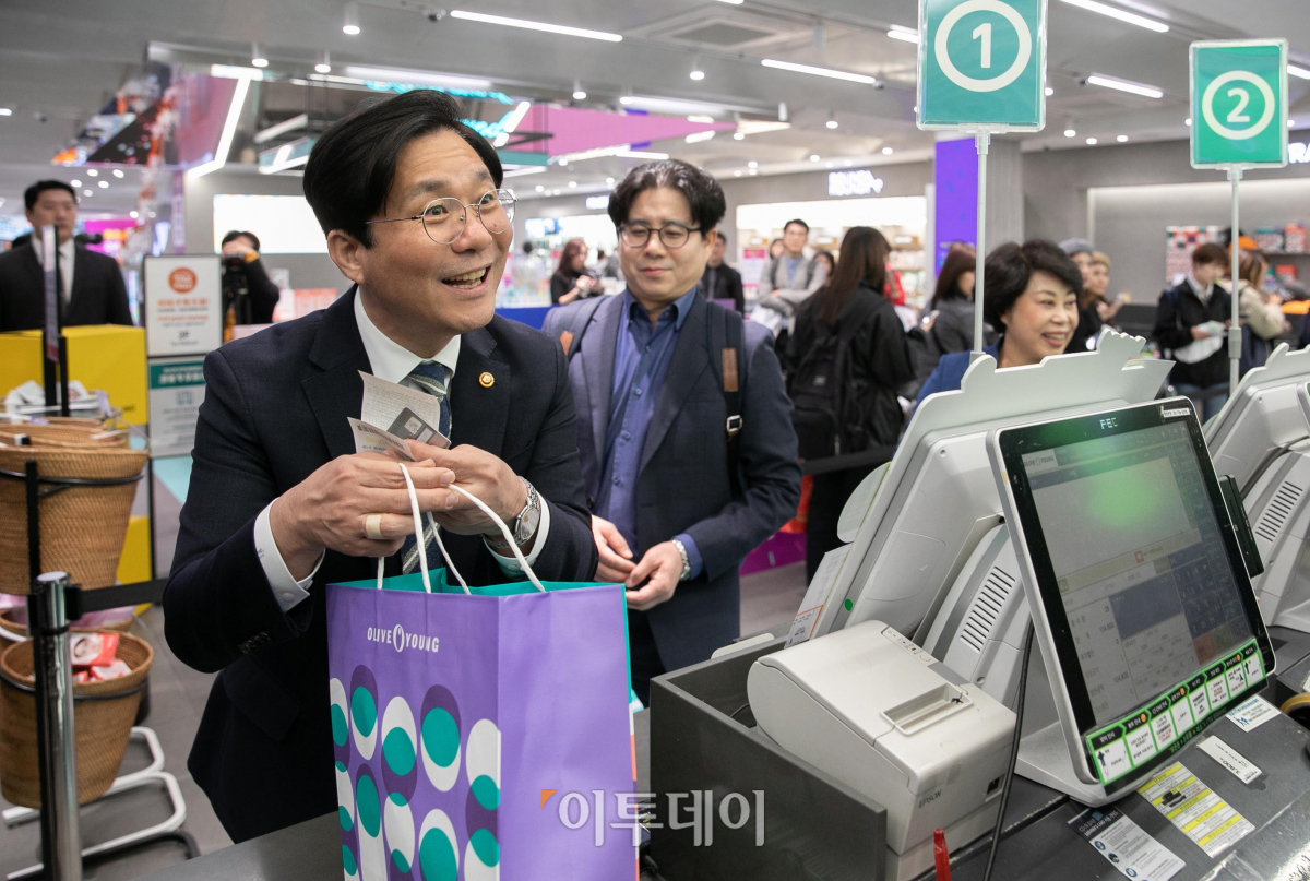 국내 최대규모의 쇼핑행사인 ‘2019 코리아세일페스타’ 시작을 하루 앞둔 31일 성윤모 산업통상자원부 장관과 김연화 2019 코리아세일페스타 추진위원회 위원장이 서울 중구 올리브영 명동본점을 찾아 제품을 구매하고 있다. 올해 코리아세일페스타는 내달 1일부터 22일까지 전국 참여업체 매장과 온라인에서 동시에 진행되며, 약 650여개 유통·제조·서비스 업체가 업체별로 할인행사를 자율 추진한다.