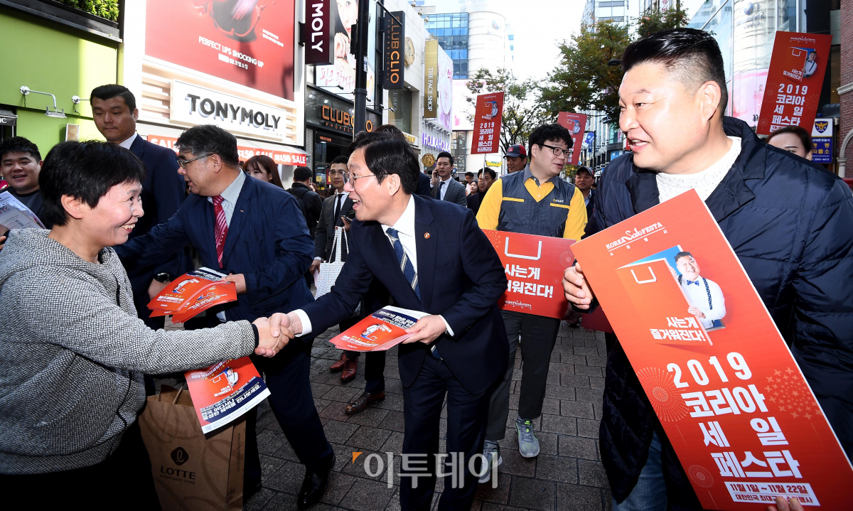 국내 최대규모의 쇼핑행사인 ‘2019 코리아세일페스타’ 시작을 하루 앞둔 31일 성윤모 산업통상자원부 장관과 홍보모델 방송인 강호동 등이 서울 중구 명동 일대에서 코리아세일페스타를 홍보하고 있다. 올해 코리아세일페스타는 내달 1일부터 22일까지 전국 참여업체 매장과 온라인에서 동시에 진행되며, 약 650여개 유통·제조·서비스 업체가 업체별로 할인행사를 자율 추진한다.