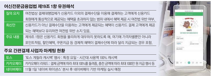 다만, 금융당국의 카드사 마케팅 제한 자체가 모순으로 근본적인 해결책이 될 수 없다는 지적도 나온다. 한 카드업계 관계자는 “(관련 여전법은) 가맹점과 협의로 하는 것이지만 당장은 신용카드를 우대해주는 제도이므로 간편결제사업자 쪽에서 우대를 문제 삼을 수 있다”며 “원래 카드사 마케팅도 제한받으면 안 되지만 받는 상황이므로 (양측의) 마케팅 총량을 제한하는 것은 모두 옳지 않다”고 지적했다.