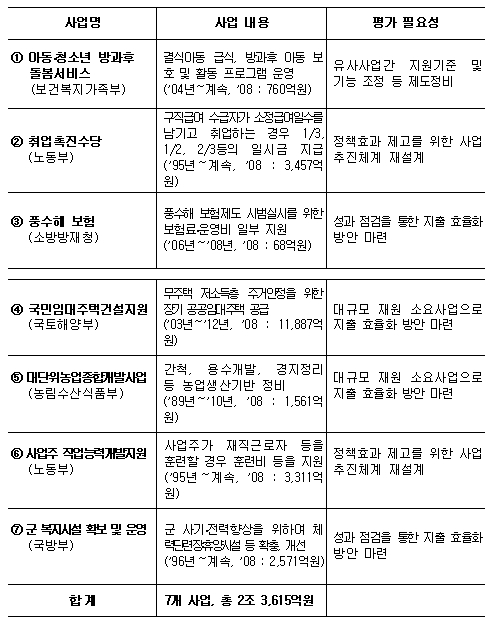 재정부는 평가 결과에 따라 성과가 부진한 사업은 중단하거나 예산을 축소하고 시범사업의 경우 본격 추진 보류 등 조치가 취할 방침이다.