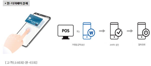 원-터치페이는 원-터치페이앱 설치 후, 온-오프라인에서 신용카드•체크카드•계좌이체 등 앱에서 결제가 가능한 서비스다. 가맹점주가 회원에게 앱으로 결제요청을 보내면 구매자는 푸시알림을 확인해 승인을 하면 결제가 완료된다. 또한, 개인 간 직거래 시에도 앱을 통해 결제요청을 할 수 있으며, 거리제약이 있는 판매자와 구매자 간에도 간편하게 사용할 수 있다. 이러한 개인 간 결제 서비스(P2P, 카드결제)는 올 12월 초 오픈을 앞두고 있다.