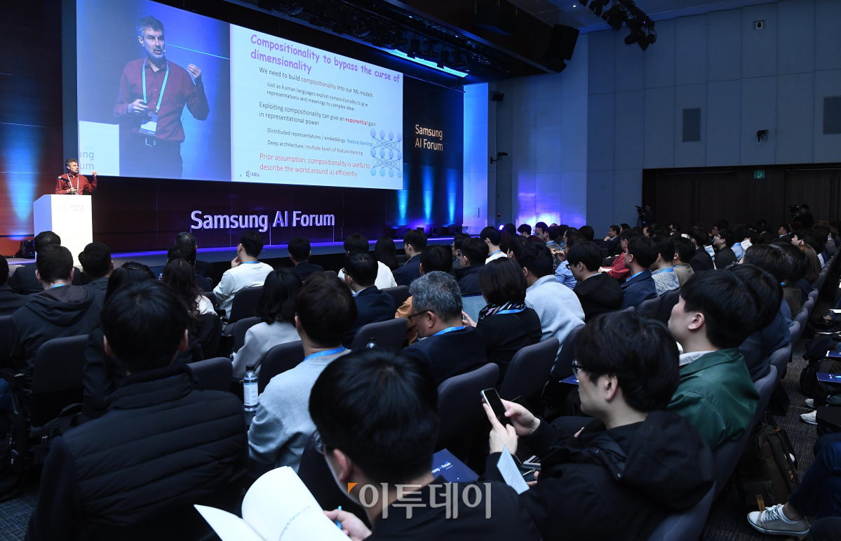 요슈아 벤지오 캐나다 몬트리올대 교수가 4일 서울 서초구 삼성전자 서초사옥에서 열린 ‘삼성 AI 포럼 2019’에서 ‘딥러닝에 의한 조합적 세계 이해’를 주제로 강연하고 있다. 삼성 AI 포럼은 저명한 인공지능(AI) 분야 석학들을 초청해 최신 연구 동향을 공유하고 응용 및 혁신 방향을 모색하는 기술 교류의 장이다.