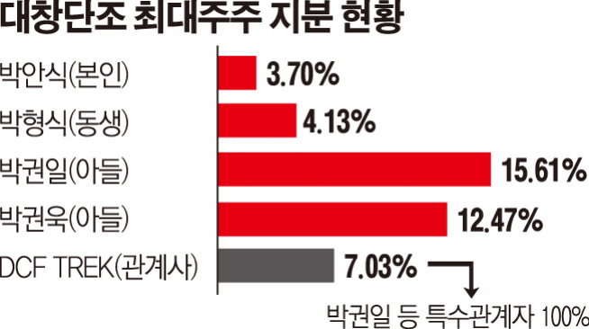5일 금융감독원 전자공시에 따르면 대창단조의 최대주주는 박안식 회장(3.70%)과 그의 동생 박형식 씨(4.13%), 박 회장의 두 아들인 박권일 사장(15.61%), 박권욱 부사장(12.47%) 외에 관계사인 DCF TREK(7.03%) 등으로 총 42.94%의 지분을 갖고 있다.
