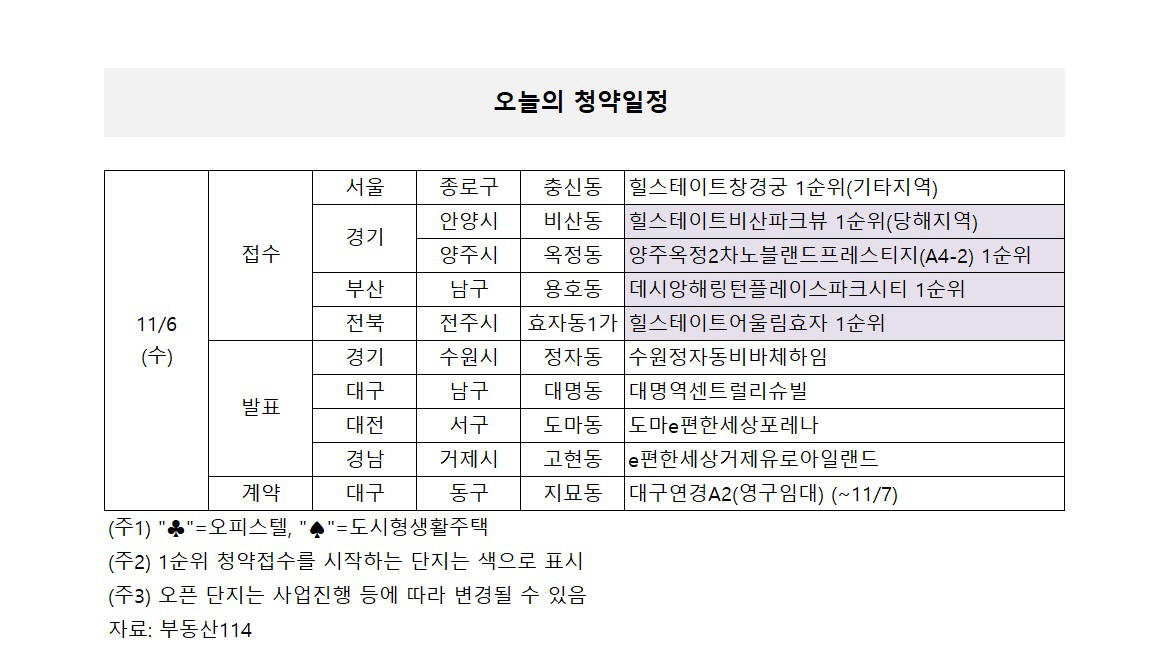 부동산114에 따르면 양주시 ‘양주옥정2차노블랜드프레스티지(A4-2)’, 부산 남구 ‘데시앙해링턴플레이스파크시티’, 전북 전주시 ‘힐스테이트어울림효자’에서 1순위 청약접수를 한다.