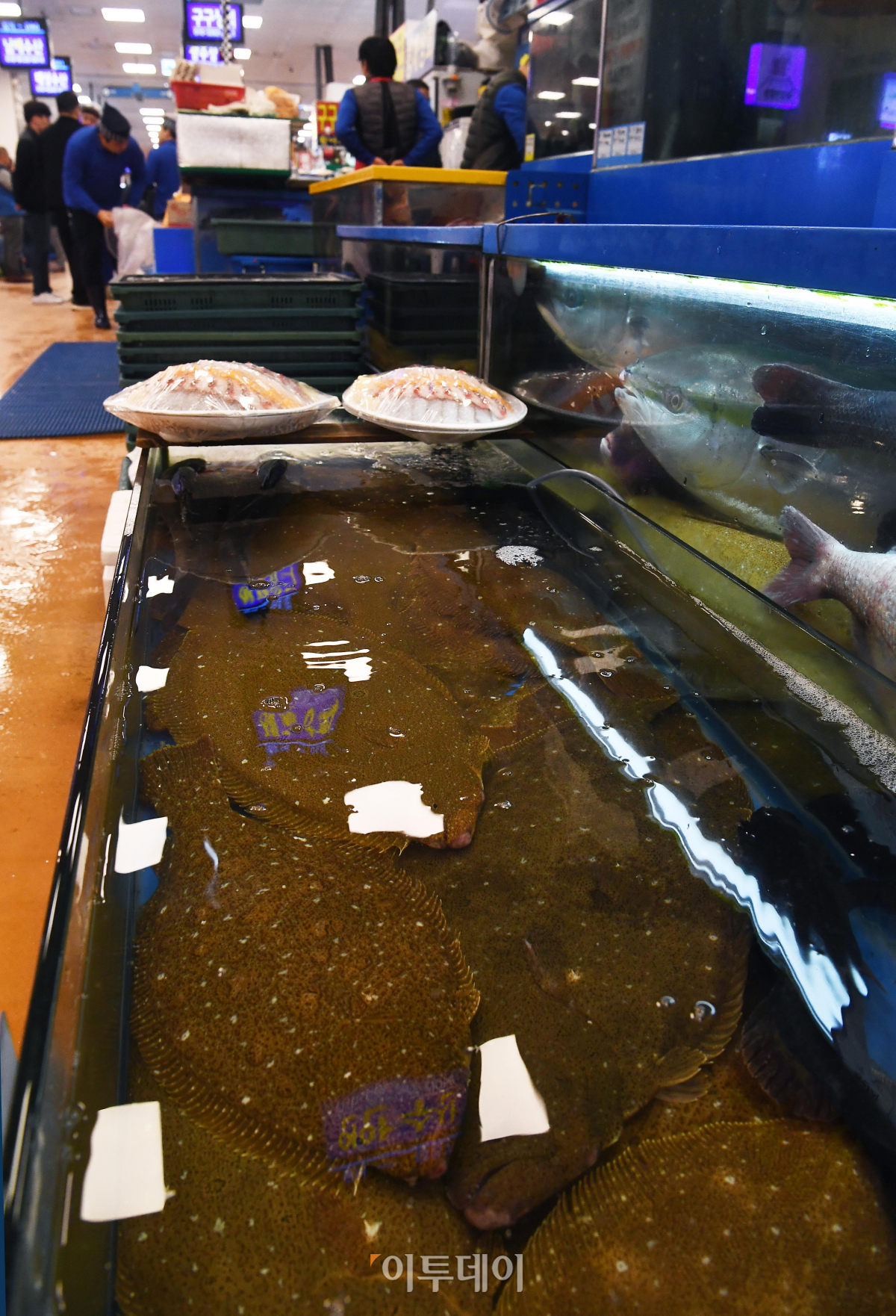 최근 양식 광어 등의 공급이 늘어나면서 생선회 소비자 가격이 13년 8개월 만에 가장 큰 폭으로 떨어진 가운데 5일 서울 동작구 노들로 노량진수산시장의 한 상점 수족관에 광어 등 횟감이 마련돼 있다. 통계청의 소비자물가 동향 조사에 따르면 지난 10월 외식 기준 생선회 가격은 작년 같은 달보다 2% 내렸다. 지난 2006년 2월 2.4%가 떨어진 뒤 가장 큰 하락폭이다. 생선회 가격 하락 기간도 길어져 지난달까지 8개월 연속 내림세를 이어갔다. 생선회 가격이 계속 내리는 이유는 공급 과잉과 관련이 있는 것으로 분석된다. 제주도는 지난달 대표적인 횟감인 양식 광어 총 200톤을 수매해 폐기하기로 했다.