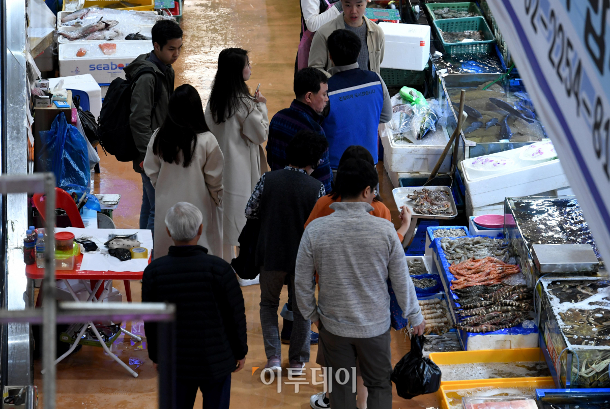 최근 양식 광어 등의 공급이 늘어나면서 생선회 소비자 가격이 13년 8개월 만에 가장 큰 폭으로 떨어진 가운데 5일 서울 동작구 노들로 노량진수산시장에서 시민들이 횟감용 생선을 살펴보고 있다. 통계청의 소비자물가 동향 조사에 따르면 지난 10월 외식 기준 생선회 가격은 작년 같은 달보다 2% 내렸다. 지난 2006년 2월 2.4%가 떨어진 뒤 가장 큰 하락폭이다. 생선회 가격 하락 기간도 길어져 지난달까지 8개월 연속 내림세를 이어갔다. 생선회 가격이 계속 내리는 이유는 공급 과잉과 관련이 있는 것으로 분석된다. 제주도는 지난달 대표적인 횟감인 양식 광어 총 200톤을 수매해 폐기하기로 했다.