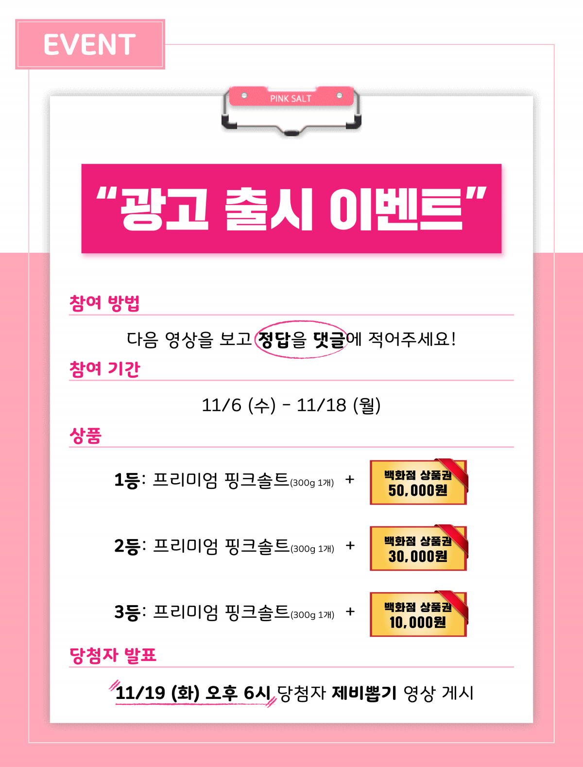 해당 이벤트는 금일(6일)부터 11월 19일까지 2주간 실시하며, 당첨자 발표는 20일에 제비뽑기 영상으로 진행될 예정이다. 1등은 프리미엄 핑크솔트 1개와 백화점 상품권 5만원권을, 2등은 프리미엄 핑크솔트 1개와 백화점 상품권 3만원권을, 마지막으로 3등은 프리미엄 핑크솔트 1개와 백화점 상품권 1만원권을 증정받을 수 있다.