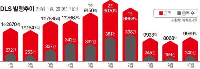 6일 예탁결제원에 따르면 최근 3개월간 DLS 발행량을 절반 수준으로 줄었다. 독일 국채 10년물 DLS 사태가 발생하기 이전인 7월 총 발행금액은 1조9968억 원을 기록했지만 이후 꾸준히 감소해 지단달 9999억 원으로 49.92% 줄었다. 발행 종목수는 398건에서 240건으로 39.69% 감소했다.