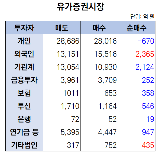 반면 개인과 기관투자자는 각각 670억 원, 2124억 원 규모를 팔아치웠다. 기관 중에서는 연기금 등이 홀로 947억 원어치 매물을 출회했다. 외에도 투신 546억 원, 보험 358억 원, 금융투자 252억 원 등을 순매도했다.