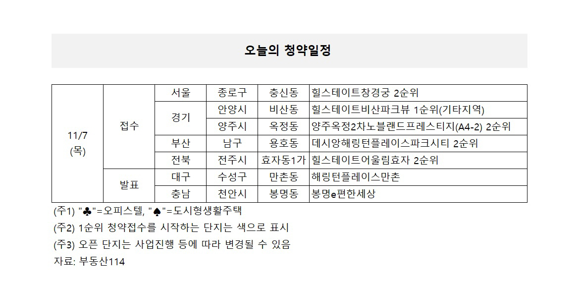 부동산114에 따르면 이날 청약 예정인 곳은 서울 종로구 ‘힐스테이트창경궁(2순위)’, 경기 안양시 ‘힐스테이트비산파크뷰 1순위(기타지역)’, 양주시 ‘양주옥정2차노블랜드프레스티지(A4-2) 2순위’, 부산 남구 ‘데시앙해링턴플레이스파크시티(2순위), 전북 전주시 ’힐스테이트어울림효자(2순위)‘ 등이다.