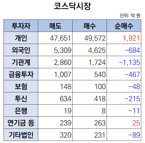 기관 중에서는 금융투자와 투신이 각각 467억 원, 215억 원어치를 팔아치우며 ‘팔자’세를 이끌었다. 반면 연기금 등은 홀로 25억 원어치를 순매수했다.