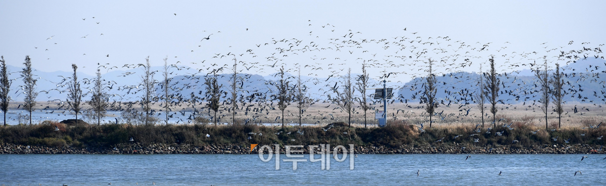 절기상 겨울이 시작된다는 입동(立冬)을 하루 앞둔 7일 경기 안산시 대송습지 위를 고니와 청둥오리 등 겨울 철새들이 날고 있다.