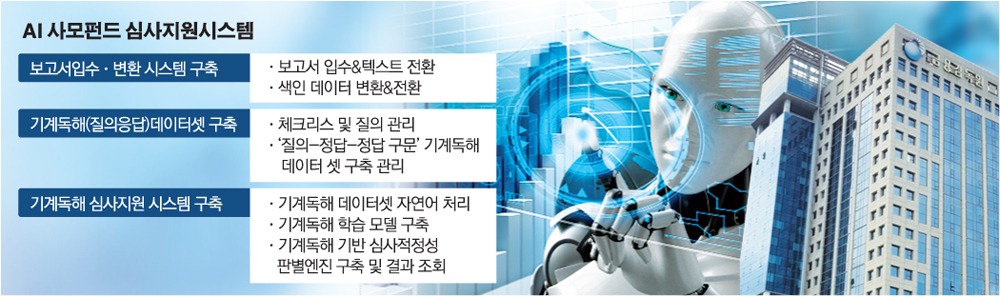 이번 시스템이 도입되면 AI 기술 중 하나인 기계독해(MRC)를 이용해 AI 엔진이 문서를 스스로 분석한 후 사전 정의된 체크리스트에 대해 최적의 답안을 추론, 제시해 심사업무를 지원한다. 기계독해는 기계가 인간처럼 텍스트를 읽고 이해해 해답을 제시하는 기술이다.