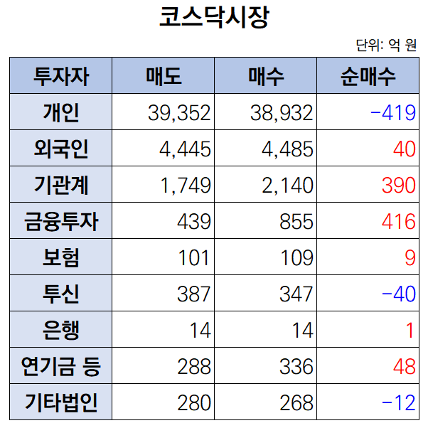 이날 외국인과 기관은 각각 40억 원, 390억 원어치를 사들였다. 따라서 외국인은 5거래일 만에 순매수로 전환했다. 반면 개인은 홀로 419억 원어치 매물을 쏟아냈다.