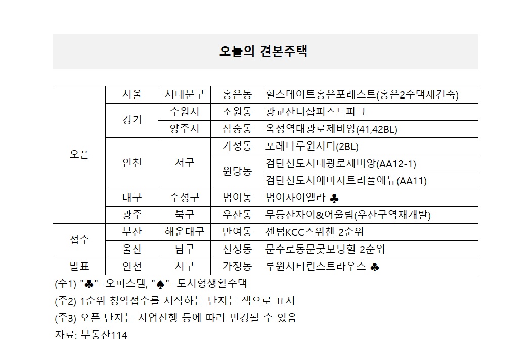 부동산114에 따르면 이날 경기 수원시 '광교산더샵퍼스트파크'·양주시 '옥정역대광로제비앙(41,42BL)', 인천 서구 가정동 '포레나루원시티(2BL)'·원당동 '검단신도시대광로제비앙(AA12-1)' '검단신도시예미지트리플에듀(AA11)', 대구 수성구 '범어자이엘라 (오피스텔), 광주 북구 '무등산자이&어울림(우산구역재개발)' 등에서 견본주택 문을 연다.