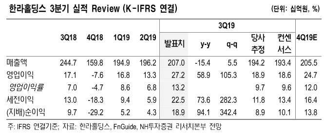 그는 “3분기 실적은 당사 예상치를 상회했는데 이는 자체사업 수익성 개선 및 만도의 통상임금 환입 효과 등이 주요 요인”이라며 “주력자회사인 만도의 3분기 실적에 통상임금 충당금 환입 효과가 있었고, 만도헬라, 한라스택폴 등의 자회사도 안정적인 성장세를 기록했다”고 분석했다.