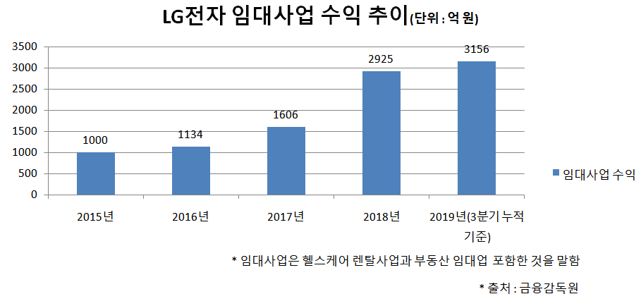 LG전자의 리스료 수익은 LG 생활가전을 임대해주는 헬스케어 렌털사업과 부동산 임대업을 통해 벌어들이는 돈을 말한다. 이 중 헬스케어 렌털사업이 차지하는 비중은 99%를 넘는다.