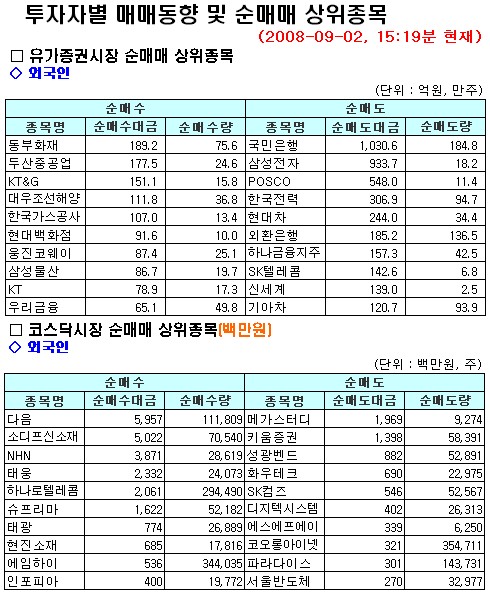 2일 국내 주식시장에서 외국인이 유가증권시장 시가총액 기준 상위 1~5위에 해당하는 국민은행과 삼성전자, POSCO, 한국전력을 중심으로 2800억원 어치를 팔아치웠다.