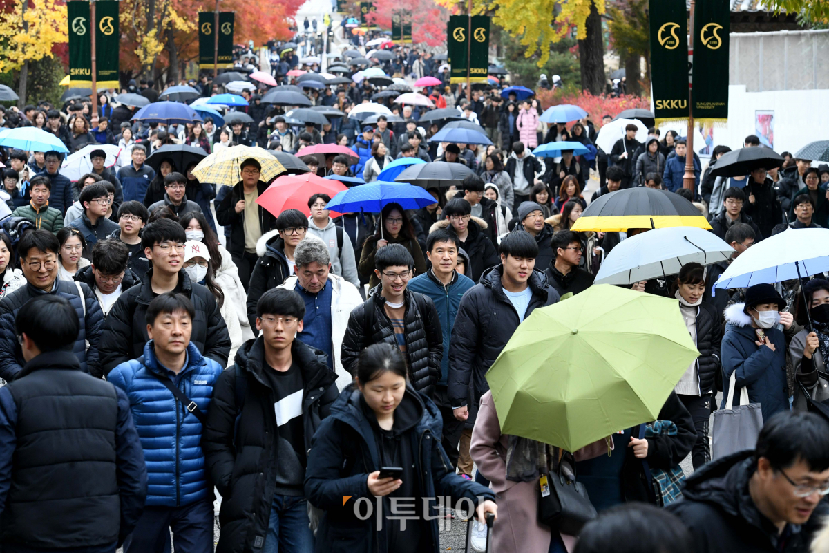 수능 후 첫 주말인 17일 서울 종로구 성균관대에서 2020학년도 대입 수시 논술고사를 치른 수험생과 학부모들이 교정을 나서고 있다.