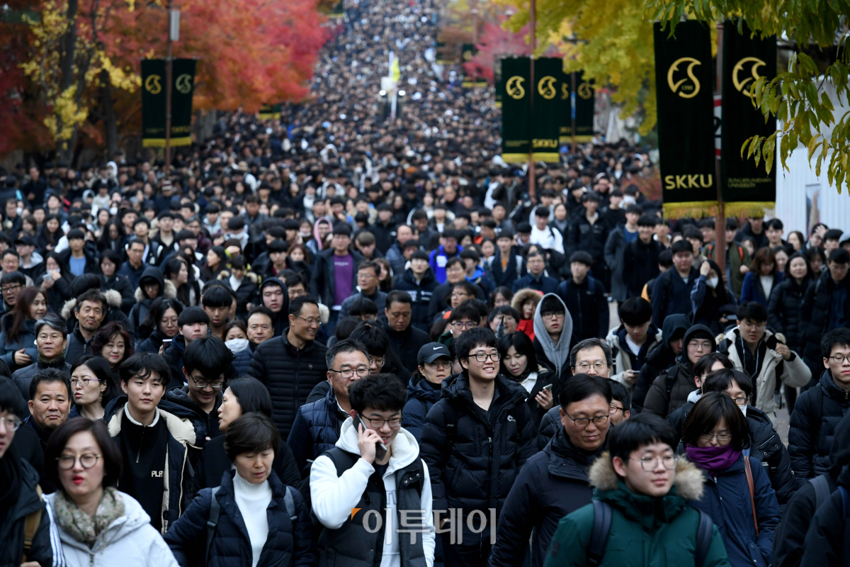 수능 후 첫 주말인 17일 서울 종로구 성균관대에서 2020학년도 대입 수시 논술고사를 치른 수험생과 학부모들이 교정을 나서고 있다.