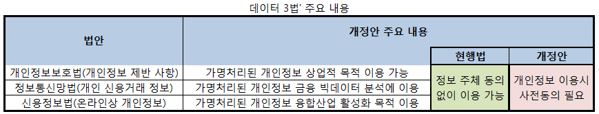 문 대통령의 발언 이후 여당인 더불어민주당 주도로 데이터 산업 육성에 필요한 3건의 법안이 제출됐고 당론으로 채택됐다. 이들 법안에는 ‘데이터 3법’(개인정보보호법 개정안, 신용정보보호법 개정안, 정보통신망법 개정안)이라는 이름이 붙었다. 하지만 이후 1년이 넘도록 이들 법안은 여야 정쟁과 무관심에 방치된 채 한 발짝도 앞으로 나가지 못했다. 입법화에 발맞춰 사업을 준비하려던 기업 현장에서는 비명에 가까운 하소연이 쏟아졌다.
